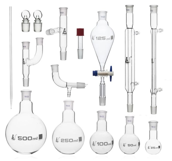 - Kit includes: 2 Lieber Condensers, Glass Stirring Rod, Cone/Screwcap Adapter, 2 Multiple Adaptors, Receiver Adaptor with Vacuum Connection, Dropping Funnel with Stopcock, 500ml Flask (round bottom), 250ml Flask (round bottom), 100ml Flask (round bottom), 50ml Flask (round bottom), 25ml Flask (round bottom), 2 Glass Stoppers.
