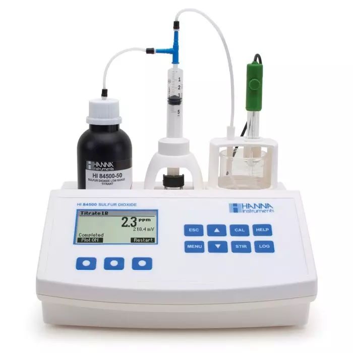 The HI84500 is a simple, fast, and affordable automatic mini titrator designed for testing free or total sulfur dioxide (SO2) levels in wine. Based on the Ripper Method, this mini titrator uses an optimized, preprogrammed method of analysis with a powerful algorithm that determines the completion of the titration reaction by the use of a specialized ORP electrode.