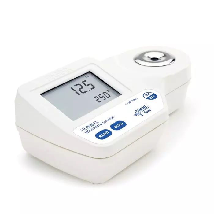 The HI96811 is a rugged, portable digital refractometer designed for sugar measurement of wine, juice and must. The HI96811 reports sugar content as % Brix and has a high accuracy of ±0.2%. The operation of the meter is simplified with only two buttons: one button is to calibrate with distilled or deionized water and the other to take a measurement. All readings are automatically compensated for temperature variations according to the ICUMSA Methods Book standard and displayed within a 1.5 second response time. The sealed flint glass prism and stainless steel well are easy to clean. Just wipe with a soft cloth in preparation for the next sample.