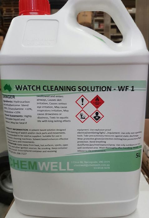 A solvent based solution designed for the cleaning of watch and/or clock parts and movements. Recommended to be used as supplied. Suitable for use in ultrasonic cleaning machines. Solvent based enhances effective drying of parts and movements.