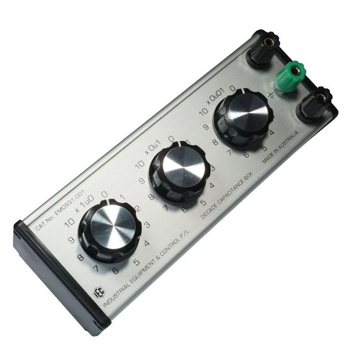 The IEC Capacitor boxes are traditional instruments that permit the selection of capacitors in decades (each dial has 10 steps). Accuracy is typically +/- 5%. This 3 dial model provides total of 11.1uF in steps of 0.01uF. Maximum voltage: 400V Dial 1: 0.01 to 0.1uF, Dial 2: 0.1 to 1.0uF, Dial 3: 1.0 to 10.0uF Connection by 4mm spin free terminals with extra terminal for earthing the housing if required.