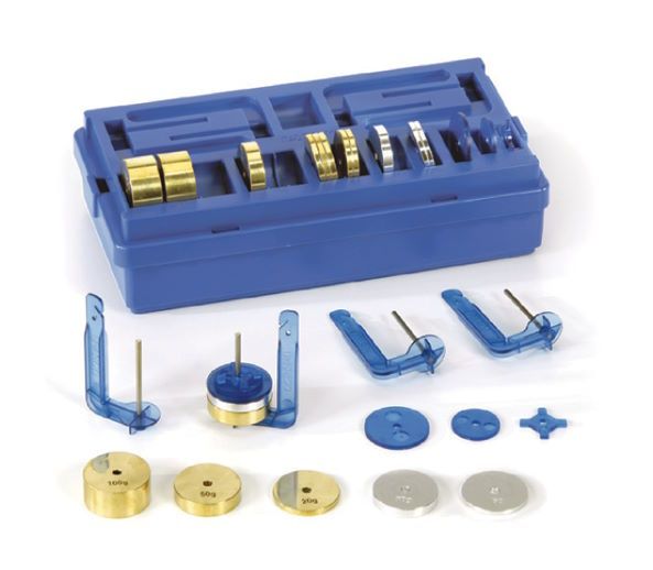 The set includes 4 hangers and 27 masses ranging from 0.5g to 100g.