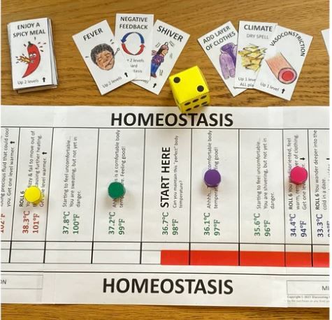 Then they play against each other to try to stay in the safe zone whilst avoiding hazards such as sunny days, freezing rain and spicy food! The winner is the player who stays closest to homeostasis and avoids hypothermia or hyperthermia.