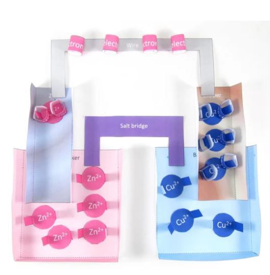 Your students first build their easy to make paper models of electrodes. They use these to see how electrical potential is formed by different electrodes and how this is measured using a hydrogen electrode with voltmeter. The differently coloured electrons make it easy to see how the electrons behave.