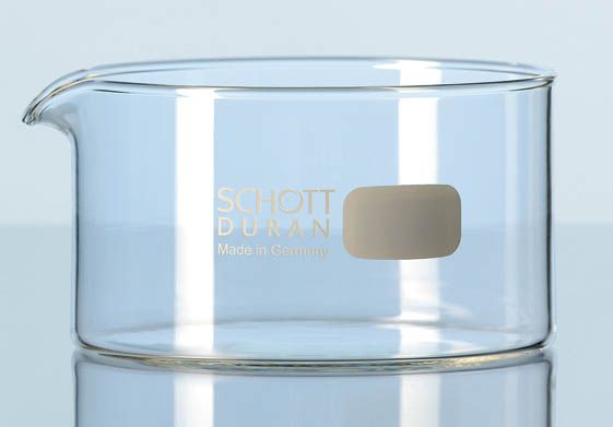 Schott Duran borosilicate 3.3 glass crystallizing dish with spout and flat bottom.