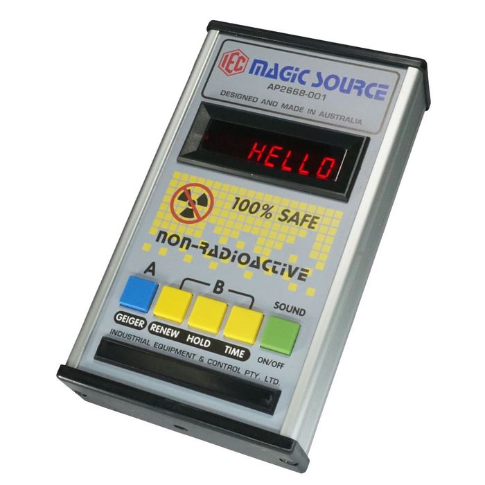 This instrument simulates a Geiger Counter but without using actual radioactive sources. It is therefore completely safe. Powered by 240/12V.AC. Plug Pak, this microprocessor based instrument can display the counts of particles leaving an imaginary r/a 'source' and also can display the number of r/a particles remaining inside the 'source'. The concept of half-life is easily demonstrated and the random nature of the particle counts can be shown. The unit is used also in Maths in the study of 'random numbers' and statistics.