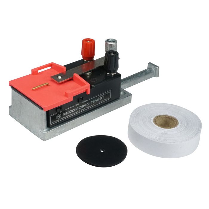The IEC 2 speed (25 & 50Hz) DC Recording Timer is very similar to the AC Recording timer, but generates the 25 & 50Hz electronically from an AC or DC source or 12V.AC or DC PlugPak. A microprocessor is used for the job and a slide switch selects the frequency. The heavy diecast base with the rubber feet allows the device to vibrate at 50Hz without the need to clamp it to the bench. The stem from the base permits it to be held on a retort stand for 'falling' experiments. The kit is complete with a 30m roll of white paper and a set of 25 carbon discs for marking the dots on the paper. Large 180m long x 16mm wide paper rolls (PA2670-006) are available together with packs of 100x carbon discs (PA2670-008).