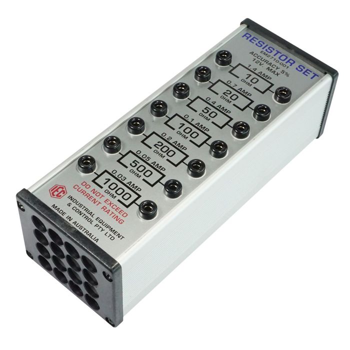 This IEC High Power Resistor Set is a unique and useful set of 7 resistors that is designed to work hard. The resistor values are higher than EM2710-002. The housing is ventilated at both ends to dissipate heat. The accuracy of these resistors is within 5% of the marked value. The resistors may be connected by 4mm banana plugs in series or parallel to make networks for experiments. The set is designed so that 12V applied to any one resistor will not overload or damage the resistor. Values are: 10, 20, 50, 100, 200, 500 and 1,000 ohms.