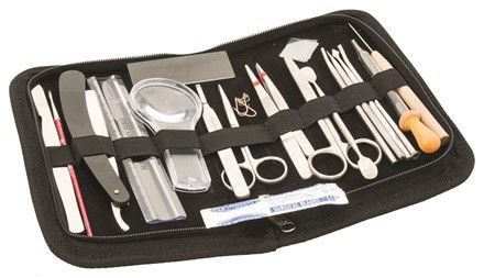 Stainless steel, consisting of 20 instruments for accurate dissection.Supplied in zipper leather case. Stainless steel, consisting of 20 instruments for accurate dissection.Supplied in zipper leather case.Scissors 2 Nos.Forceps 2 Nos.Needles 4 Nos.Scalpel 1 No.B.P. Handle with Blade 1 No.Razor 1 No.Ruler 6” 1 No.Magnifying Glass 1 No.Glass Slide 1 No.Chain and Hook 1 No.Cover Slips. 1 No.Blow Pipe 1 No.Needle Wooden Handle 1 No.Dropper Glass 1 No.Brush 1 No.