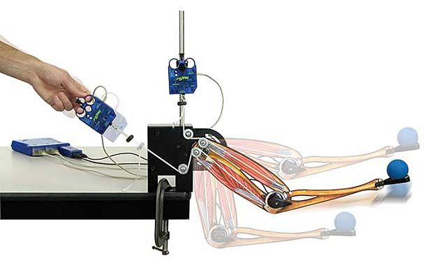 The Arm can perform many types of motion such as extending and lifting an object, curling, or throwing a ball overhand. Different arm muscles are activated depending on which pulleys are selected. Static force measurements can also be made to see how the muscle tension changes at various arm positions.