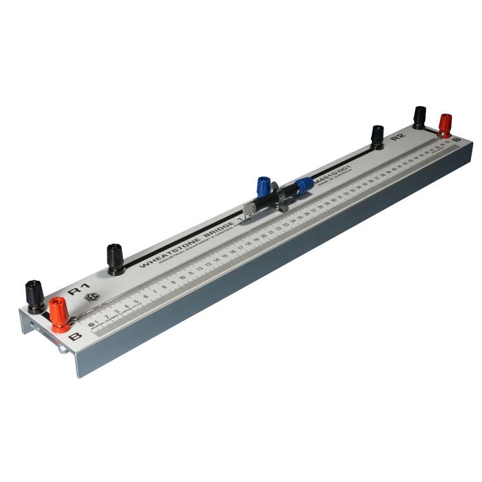 The IEC Wheatstone Bridge is the classic instrument for measuring resistance using the 'balanced bridge' method. IEC makes both 1m and 1/2m long bridges. The 1m bridge has 4x gaps and the 1/2m bridge has 2 gaps for external component connection. The terminals are IEC spin free head 4mm socket type so that banana plugs or wires can be used for connection.