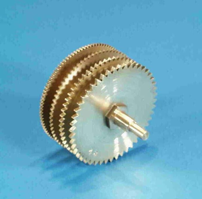 The 'Savart's Tone Wheel' consists of 4 metal discs about 73mmD, mounted on a central shaft so that the set of 4 can be rotated. Each disc has a different number of teeth cut into it so that when a stiff card is placed against the edge of a wheel, a tone is produced. The teeth are 36, 45, 54 and 72 and this is a ratio of 4, 5, 6, and 8. The combined sound of all 4 discs touching the stiff card is a natural musical chord.