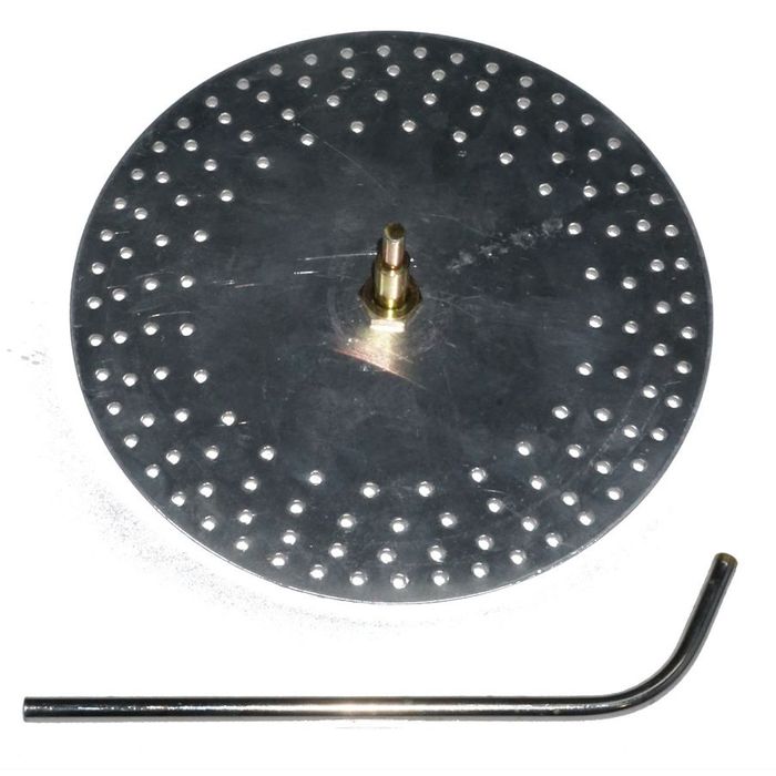 The 'Siren Disc' consists of a metal disc about 180mmD, mounted on a central shaft so that it can be rotated. The disc has 4 rows of holes around it and when a fine jet of air is blown through the rotating holes, a 'siren tone' is produced. The holes are 24, 30, 36 and 48 and this is a ratio of 4, 5, 6, and 8. The combined sound of all 4 holes creating a siren sound is a natural musical chord. For the blow tube only, see SW3770-001