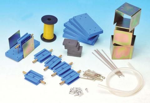 The kit comprises all the part required to build 6 model motors as in the electromagnetic kit. Each kit contains 12 pieces of magnets, 6 pieces of armatures, 6 pieces of mild steel yokes, 6 pieces of support bases, 6 pieces of shaft, 24 pieces of rivets, 12 pieces of split pins, 1 reel of 26 s.w.g. PVC tinned copper wire, 2 reels of cellotape, 300 mm rubber tubing of 3 mm bore.
