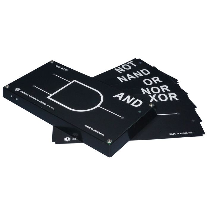 The IEC "Demonstration Gates" trainer is a fun to use method of learning the functions of electronic digital GATES. An overlay is fitted to the panel and the panel is held up facing the class. Student are asked to predict the outcome of input combinations on the output of the gate. The teacher manipulates slide switches on the rear side of the panel to make the gates work and LEDs show through the overlay to indicate the results to the students. The overlay used and the expected result and LEDs are visible also to the teacher to avoid embarrassments. If placed into the students' hands, they can test one another until the function of all the types of GATES is fully understood.