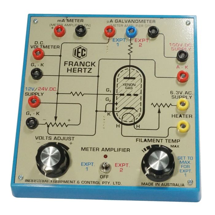 The IEC 'Franck Hertz' apparatus is a self contained lab consisting of an electron tube (called a Thyratron) that contains Xenon gas in the glass envelope and various electrodes to permit the excitation of the gas molecules.