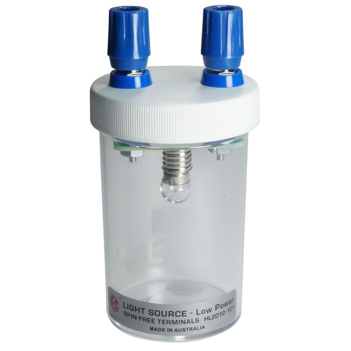 A simple light source in a protective housing, used in the teaching of basic electricity. There are two versions of this light source which is housed in a simple transparent plastic vial. HL2012-001 uses 4mm sockets for connection and HL2012-101 uses 4mm spin free IEC terminals for the connection of cables. These small light sources use an MES lamp screwed into a socket.