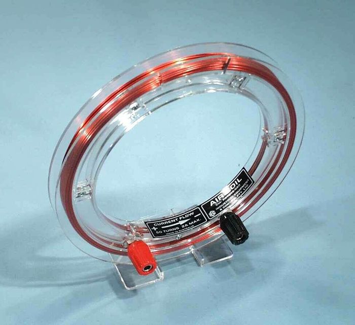 This large general purpose air cored coil is similar to a Helmholtz coil but the number of turns is 50 and the wire is thicker to carry a larger current of about 2A. It can lie flat or can stand edgeways from the table. It is complete with 4mm spin free IEC terminals. Average diameter of the coil is 150mm and coil resistance is about 0.7ohm. To keep the current at 2A, the maximum voltage permitted is about 1.4V AC or DC.. Higher currents can be used for short periods.